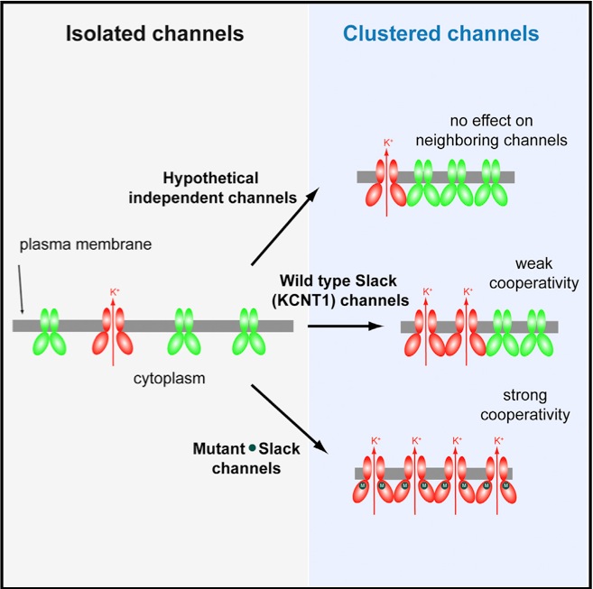 Disease-causing mutations in ion channels generally alter intrinsic gating properties such as activation, inactivation, and voltage dependence. We examined nine different mutations of the KCNT1 (Slack) Na(+)-activated K(+) channel that give rise to three distinct forms of epilepsy. All produced many-fold increases in current amplitude compared to the wild-type channel. This could not be accounted for by increases in the intrinsic open probability of individual channels. Rather, greatly increased opening was a consequence of cooperative interactions between multiple channels in a patch. The degree of cooperative gating was much greater for all of the mutant channels than for the wild-type channel, and could explain increases in current even in a mutant with reduced unitary conductance. We also found that the same mutation gave rise to different forms of epilepsy in different individuals. Our findings indicate that a major consequence of these mutations is to alter channel-channel interactions.