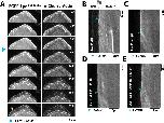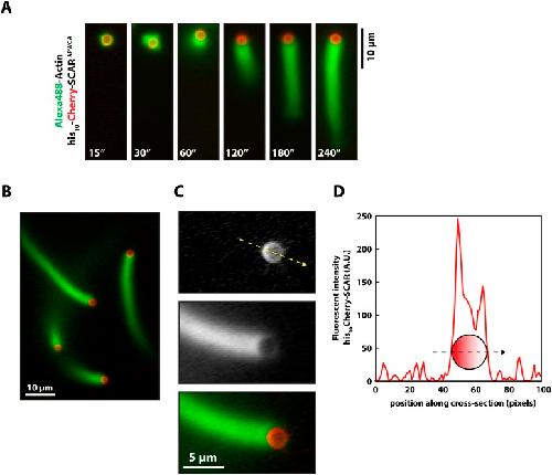 Figure 3—figure supplement 1. Actin based motility on lipid coated glass beads.(A) Montage of actin comet tails frozen at different times point with 37.5 µM Latrunculin B-phalloidin containing buffer. Actin networks were assembled in the presence of 7.5 µM actin (5% Alexa488), 50 nM Arp2/3, 100 nM capping protein, 6 µM hPro1, 3 µM cofilin. Scale bar, 10 µm. (B) Image of actin comet tails at steady-state in the presence of cofilin dependent network recycling described in (A). Scale bar, 10 µm. (C) Images of asymmetric his10-Cherry-SCARAPWCA localization in the presence of actin comet tail. Scale bar, 5 µm. (D) Line scan across lipid coated bead surface in (C) showing fluorescent intensity of asymmetric his10-Cherry-SCARAPWCA.DOI: http://dx.doi.org/10.7554/eLife.06585.007 |