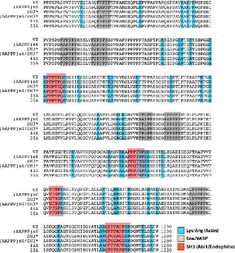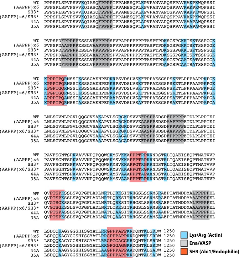 Figure 5—figure supplement 2. Lpd (850–1250aa) wild-type and mutant protein sequence alignment.Protein sequence alignment of Lpd850−1250aa wild-type and mutants highlighting the separation of function mutations targeting either the actin BD (arg/lys; BLUE), Ena/VASP binding sites (GRAY), or Abi1/Endophilin SH3 domain binding sites (RED).DOI: http://dx.doi.org/10.7554/eLife.06585.016 |
