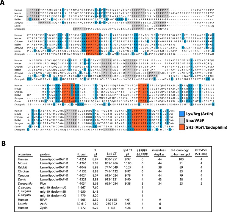 Figure 2. Conservation of Lpd (850–1250aa) amino acid sequence and isoelectric point (pI).(A) Protein sequence alignment of human Lpd and homologs C-termini. Basic amino acid residues (arginine and lysine) are highlighted in blue. Gray boxes mark the location of the canonical Ena/VASP homology 1 (EVH1) BDs (i.e., FPPPP or LPPPP), while red boxes highlight the predicted Abi1/endophilin SH3 domain binding sites (i.e., PxxPxR). Secondary structure prediction algorithms suggest that the Lpd (850–1250aa) lacks secondary structure (data not shown). (B) Comparison of Lpd, Pico, mig-10, RIAM, ActA, and Zyxin pIs across the canonical Ena/VASP BD containing one or more FPPPP motifs. Domain boundaries for this region are termed, Lpd C-terminus (Lpd CT). The number of arginine and lysine residues were calculated across the region specified ‘Lpd C-terminus (Lpd CT)’. The number of Ena/VASP and SH3 domain binding sites were counted across the domain boundaries defined, Lpd CT, and are shown in columns five and six, respectively. The pIs for Lpd CT were calculated using EXPASY (Wilkins et al., 1999). Abbreviations are as follows: full-length (FL); binding-domain (BD); Lamellipodin (Lpd).DOI: http://dx.doi.org/10.7554/eLife.06585.005 |