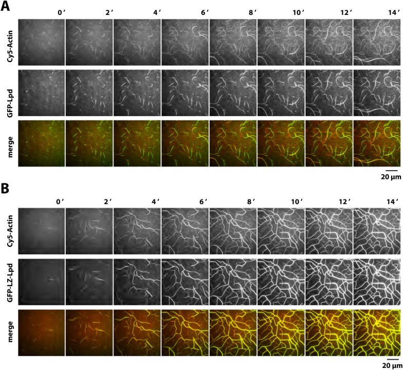 Figure 8—figure supplement 1. Lpd dependent actin filament bundling.(A, B) Lpd bundles dynamically elongating actin filaments. Montage showing single actin filaments elongating and bundling in the presence of 2 µM actin (5% Cy5 labeled) and either (A) 1 µM GFP-Lpd850−1250aa or (B) 1 µM GFP-LZ-Lpd850−1250aa (dimer concentration equals 0.5 µM) in TIRF buffer containing 50 mM KCl. Note that the intensity of single actin filaments is faint due to the low percentage of Cy5-labeled actin and low laser intensity used to prevent camera pixel saturation by the bright actin filament bundles. Scale bar, 20 µm.DOI: http://dx.doi.org/10.7554/eLife.06585.026 |