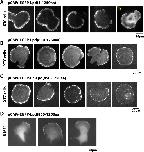 Figure 6. Dynamic actin filament assembly and free barbed ends are required for leading localization of GFP-Lpd (850â1250aa).(A) Dynamic actin assembly is required for maintenance of GFP-Lpd850â1250aa leading edge localization. Image montage showing translocation of GFP-Lpd850â1250aa and mCherry-Actin toward the cell body, following the addition of 8 µM Jasplakinolide and 10 µM Latrunculin B. Note that a population of GFP-Lpd850â1250aa remains associated with the peripheral membrane after addition of Jasp-LatB (yellow arrowhead). Horizontal scale bar, 5 µm. Vertical scale bar, 2 min. (BâE) Barbed ends are required for plasma membrane localization of (B) GFP-Lpd850â1250aa, (C) GFP-LZ-Lpd850â1250aa, (D) GFP-Lpd850â1250aa (AAPPP)x6, and (E) GFP-Lpd850â1250aa (AAPPPx6 + SH3*). Representative kymographs showing membrane dissociation of GFP-Lpd850â1250aa, wild-type and mutants, following the addition of 100 nM Cytochalasin D (blue arrowhead). Horizontal scale bar, 5 µm.DOI: http://dx.doi.org/10.7554/eLife.06585.019 |