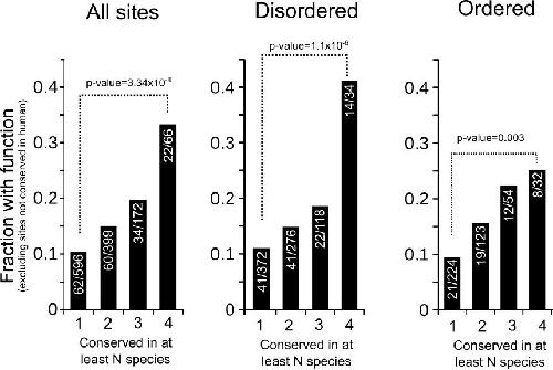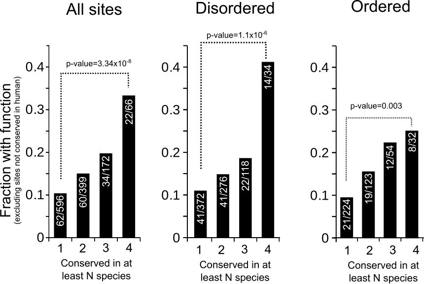 For each X. laevis phosphosite we counted the number of species in which the orthologous peptide region is also phosphorylated. We excluded all phosphosites that are not also phosphorylated in human. We then calculated the fraction of sites that are known to play a functional role in human. The degree of conservation is found to enrich significantly for sites with a known function for all X. laevis sites as well as sites that are in ordered or disordered regions.