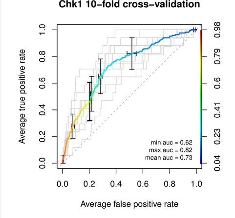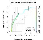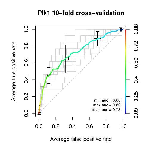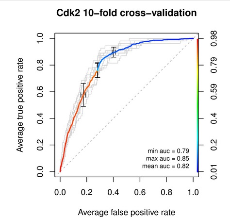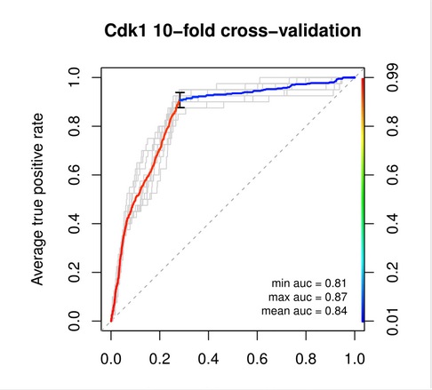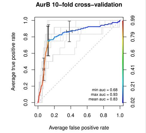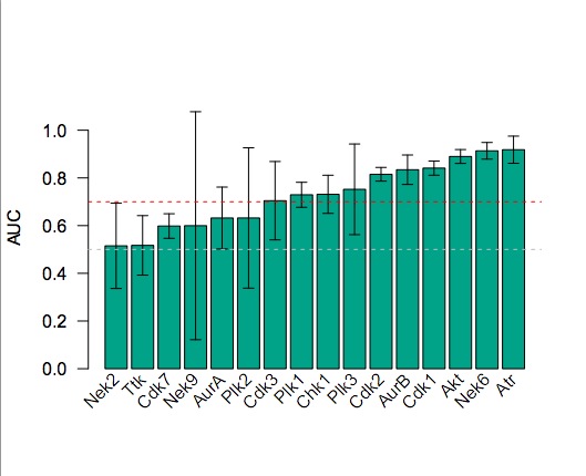 For 16 cell-cycle kinases with many known target sites (Akt, Atr, AurA, AurB, Cdk1, Cdk2, Cdk3, Cdk7, Chk1, Nek2, Nek6, Nek9, Plk1, Plk2, Plk3, Ttk), position specific scoring matrices (PSSMs) were derived for each kinase and benchmarked on a set of known target sites using a cross-fold validation 16. We show here the AROC curves for the cross validation for each kinase.