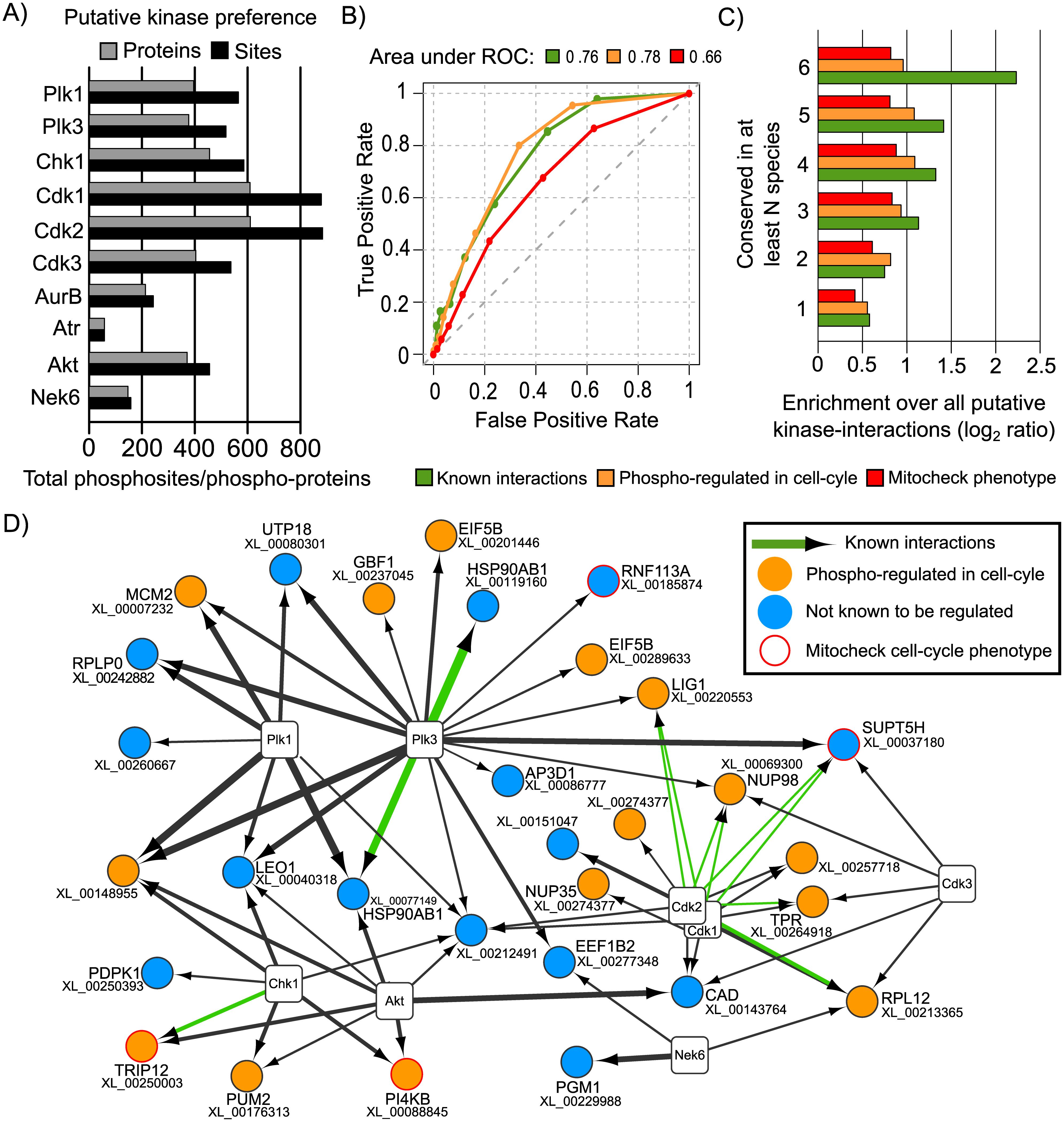A) The number of predicted kinase target sites and proteins associated with cell-cycle kinases selected for analysis in X. laevis. We tested if the degree of conservation of kinase-interactions was predictive of known interactions; enriched in proteins that are phospho-regulated in the cell cycle; and genes known to cause cell cycle phenotypes when knocked down. B) ROC curves measuring the accuracy for kinase-interaction predictions. C) Enrichment over random prediction for the 3 tested features. D) Predicted kinase interactions conserved in 7 or more species are shown, highlighting known interactions, proteins phospho-regulated during the cell cycle and genes causing cell cycle phonotypes. The edge thickness is proportional to the degree of conseravtion for the predicted kinase-protein interactions. A list of these interactions is provided in S4 Table.