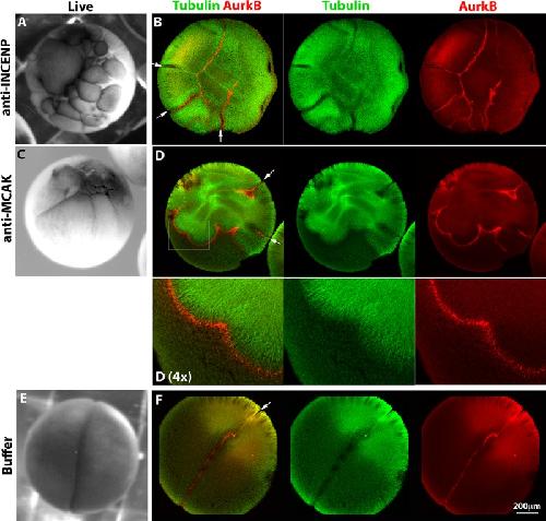 FIGURE 3: Forced activation of the CPC induces ectopic furrows. Monospermic eggs were injected after first mitosis (60–70 min postfertilization) and time-lapse imaged to score cleavage (A, C, E), or fixed around the time of first cleavage and stained for tubulin and AurkB for CPC (B, D, F). (A, B) Injection with an activating anti-INCENP IgG. (A) Note multiple ectopic furrows. (B) Note ectopic microtubule assemblies with CPC strongly localized to their peripheries. Furrows initiated where CPC planes touched the cortex (white arrows). (C, D) Injection with inhibitory IgG to MCAK (Kif2C), the predominant microtubule catastrophe factor in frog eggs. (C) Note multiple ectopic furrows. (D) Note ectopic, CPC-positive microtubule assemblies and associated ectopic furrows (white arrows) as in B. (E, F) Injection with buffer only. A single cleavage furrow forms (E and white arrow in F).