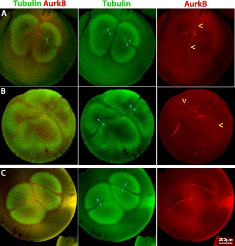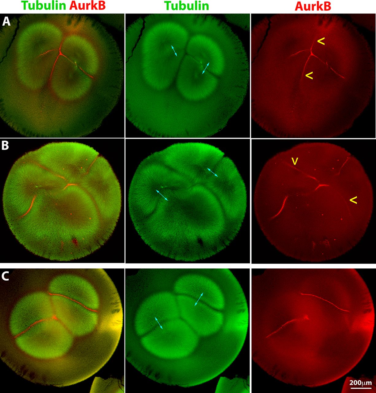 FIGURE 4:. Forced activation can recruit the CPC to interaction zones between nonsister asters. An activating anti-INCENP IgG was injected into polyspermic eggs 60–70 min postfertilization (after first mitosis). Sister asters in A–C are indicated by cyan double-headed arrows. (A) Bispermic egg fixed 90 min postfertilization. Note recruitment of CPC at similar levels to the interaction zones between sister and nonsister asters (CPC recruitment between nonsisters is highlighted by yellow arrowheads). Note that the aster morphology has been slightly distorted by the injection. (B) Bispermic egg fixed 98 min postfertilization. Same labeling convention as in A. CPC is recruited to interaction zones between nonsister asters. (C) Uninjected bispermic egg fixed at the same stage as A for comparison. CPC is not recruited between nonsister asters.