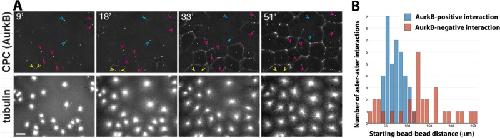 FIGURE 6: Initial distance between nucleating sites influences CPC recruitment. The same experiment as in Figure 5 was performed without molecular perturbations. The CPC probe is directly labeled anti-AurkB, and beads coated with anti-AurkA are the aster nucleators. Bead pairs were identified based on whether their asters interacted at the end of the movie. The distance between the bead pairs was measured at the start of the movie, and whether or not a CPC-positive zone formed between beads was scored upon initial aster–aster contact. (A) Example images from a time-lapse sequence. Arrowheads indicate typical bead pairs. Yellow and blue show examples where AurkB-positive zones did not form between beads; magenta shows examples where AurkB-positive zones did form. Note that the yellow arrowheads are close together (n = 2), blue arrowheads are further apart (n = 7), and magenta arrowheads are separated by an intermediate distance (n = 15). (B). Histogram of initial bead separations plotted separately for bead pairs where an AurkB-positive zone did (blue bars; n = 39) or did not (red bars; n = 30) form upon aster–aster contact. Initial distances were pooled for multiple fields imaged in parallel in two independent experiments (six fields total). Note that the initial separation distance was unimodal for bead pairs for which a CPC-positive zone did form. The distribution was much more spread out, and possibly bimodal, for bead pairs for which a CPC-positive zone did not form.