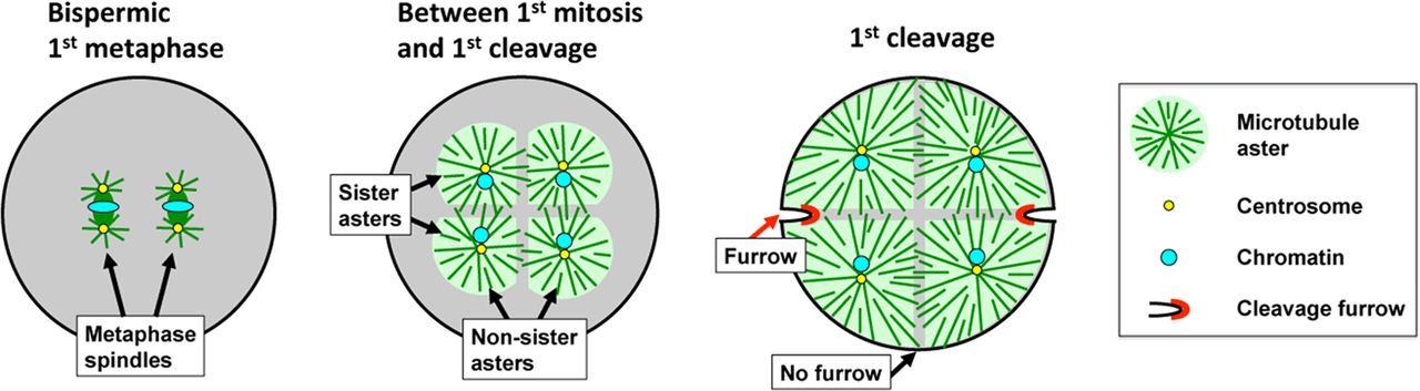 Cleavage pattern in a bispermic frog egg. Metaphase spindles in Xenopus are ∼50–60 μm long in a 1.2-mm egg. After anaphase onset, the small asters at the spindle poles grow steadily until they fill the cell. Asters from the two poles of the same spindle (sister asters) contact each other soon after anaphase onset at the plane previously occupied by the metaphase plate. Asters from the poles of two different spindles (nonsister asters) contact each other later. In both cases, aster growth halts where the asters contact each other, and a zone of lower microtubule density is observed at the aster–aster interaction zone (gray shading). When asters grow to touch the cortex, furrows initiate between sister aster pairs but not between nonsister pairs. Adapted from Brachet (1910), Wühr et al. (2009), Snook et al. (2011), and Mitchison et al. (2012).