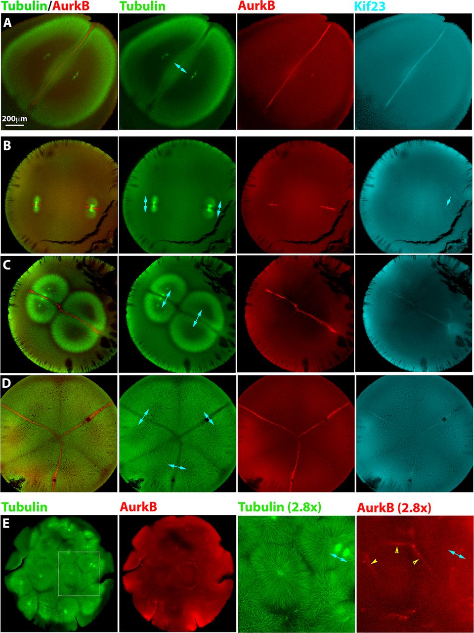 FIGURE 2: Localization of furrow-inducing protein complexes in polyspermic eggs. Eggs were fixed between first mitosis and first cleavage, stained for AurkB (a subunit of the CPC) and Kif23 (a subunit of Centralspindlin), and imaged by confocal microscopy. Cyan double-headed arrows illustrate sister aster pairs. (A) Normal, monospermic egg. Note plane of CPC- and Centralspindlin-positive microtubule bundles between sister asters. (B) Bispermic egg fixed a few minutes after anaphase onset. The asters have just started to grow. A CPC-positive disk is evident at the plane previously occupied by the metaphase plate, where sister asters recently met. Centralspindlin recruitment is less evident (cyan single arrow in Kif23 image). (C) Bispermic egg fixed midway between anaphase and cleavage. Interaction zones between sister and nonsister asters were evident in the tubulin image. Note a brighter tuft of microtubules that connects the sister pair to the upper left, in register with the centrosomes. This midzone-like morphological marker reveals the previous position of the spindle and was used to identify sister aster pairs in microtubule images. CPC and Centralspindlin have been recruited to the interaction zone between sister asters but not to the zone between nonsister asters. (D) Egg with four sperm fixed early in cleavage. Cleavage has initiated near the animal pole (not shown). This image shows a focal plane near the equator, where three aster pairs are visible. Furrowing had not yet occurred in this focal plane, but asters had grown all the way to the cortex. Note selective recruitment of CPC and Centralspindlin to zones between sister asters. (E) Highly polyspermic egg fixed early in cleavage. The region presented at higher magnification shows a single aster with CPC-positive zones at the junction with several neighboring asters (yellow arrowheads). None of these are zones with its sister aster, which is in a different z-plane.