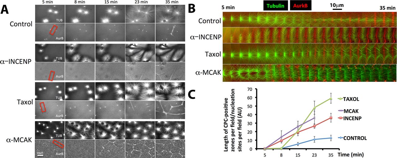 FIGURE 5: Forced activation of the CPC promotes recruitment in the extract system. Interphase egg extracts containing fluorescence probes for tubulin and the CPC (directly labeled anti-AurkB) and beads coated with anti-AurkA as artificial centrosomes. (A) Representative images from time-lapse sequences collected in parallel from the same preparation of extract. Note that more CPC-positive zones were formed between nucleating sites in extracts treated with activating IgG to INCENP, Taxol (0.5 μM final), and inhibitory IgG to MCAK than in control. Once formed, CPC-positive zones were stable for the duration of experiments under all conditions except MCAK inhibition, where they formed early relative to control but then decayed. (B) Higher-magnification image sequences of the regions shown by red boxes in A. Regions were chosen to highlight the establishment and growth of CPC-positive zones between nucleating sites. Note that the zone from control and Taxol-treated extracts grows laterally after it initiates. CPC-positive zones formed earlier when the CPC was activated or microtubules were stabilized. (C) Quantification of CPC-positive zone formation from multiple image fields. At each time point, the length of CPC-positive zones in a field was measured and divided by the number of nucleating beads in the field. Note that CPC stimulation (anti-INCENP), Taxol, and MCAK inhibition all stimulated the rate and extent of CPC-positive zone formation. The last time point was omitted from the MCAK inhibition experiment because CPC-positive zones were unstable under this condition. With regard to A, see Supplemental Movies S5A Control and S5B Taxol.