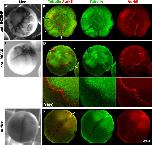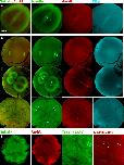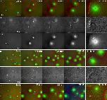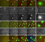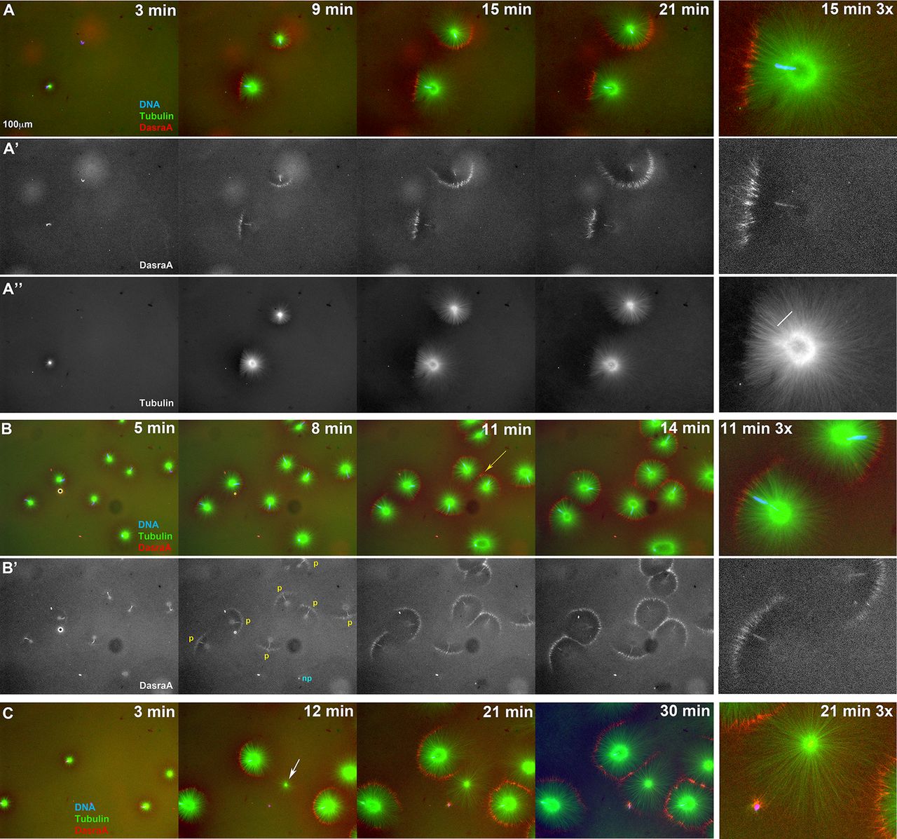 FIGURE 7:. Chromatin spatially biases CPC recruitment to monopolar sperm asters in egg extract. Permeabilized sperm was added to interphase egg extract supplemented with probes for DNA, tubulin, and the CPC (GFP-DasraA). (A–C) Image sequences chosen to emphasize different aspects of this reaction. The last in each series is a 3× magnification. Time points are as indicated. (A) Two isolated sperm asters. Note polarized microtubule distribution and formation of an arc of CPC-positive bundles on the periphery of each aster on the same side as the DNA. (A′) Only the DasraA channel for the same images as A. Note that the DasraA probe binds sperm chromatin. (A′′) Only the microtubule channel. (B) Field at higher sperm density. (B′) Same images in DasraA channel alone. Seven of eight of the asters polarize early (yellow p), and one aster never polarizes (cyan np). Later most asters contact a neighbor and form a CPC-positive interaction zone; yellow arrow at 11-min time point (B). (C) Field that includes a centrosome not attached to a sperm nucleus (white arrow in 12-min image). The centrosome nucleated a weaker aster than the sperm-attached centrosomes. The free centrosome aster did not recruit CPC to its periphery until it contacted a neighboring aster (30-min time point). The bright dot on the lower left side of the free centrosome aster is DNA without a centrosome. With regard to A–C, see Supplemental Movies 7A–7C, respectively.