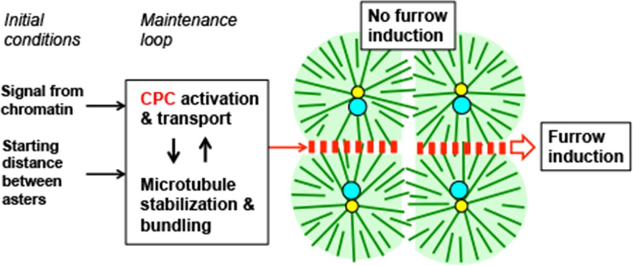 FIGURE 8:. Model illustrating results and hypothetical underlying mechanisms. The image illustrates the situation in a bispermic egg between first anaphase and first cleavage, similar to the cartoon in Figure 1 and the experimental examples in Figures 2C and 4C. Color coding and orientation of sister and nonsister aster pairs are as in Figure 1; red boxes indicate CPC and Centralspindlin complexes. The text boxes linked by arrows are factors we identified that control CPC recruitment and activation. We hypothesize that locally acting signals from chromatin (Figure 7) and the starting distance between asters (Figure 6) together provide an initial bias that promotes CPC recruitment between sister asters and are lacking between nonsister asters. We further hypothesize that CPC activation/recruitment (Figures 3–5) and microtubule bundling/stabilization (Figures 3 and 5) together constitute a positive feedback loop that promotes CPC retention on microtubule bundles and lateral spreading of CPC-positive bundles. These positive feedbacks allow a CPC-positive interaction zone to grow radially from the site previously occupied by the metaphase plate all the way to the cortex while retaining its CPC-positive state.