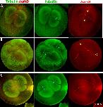 FIGURE 3:. Forced activation of the CPC induces ectopic furrows. Monospermic eggs were injected after first mitosis (60–70 min postfertilization) and time-lapse imaged to score cleavage (A, C, E), or fixed around the time of first cleavage and stained for tubulin and AurkB for CPC (B, D, F). (A, B) Injection with an activating anti-INCENP IgG. (A) Note multiple ectopic furrows. (B) Note ectopic microtubule assemblies with CPC strongly localized to their peripheries. Furrows initiated where CPC planes touched the cortex (white arrows). (C, D) Injection with inhibitory IgG to MCAK (Kif2C), the predominant microtubule catastrophe factor in frog eggs. (C) Note multiple ectopic furrows. (D) Note ectopic, CPC-positive microtubule assemblies and associated ectopic furrows (white arrows) as in B. (E, F) Injection with buffer only. A single cleavage furrow forms (E and white arrow in F).