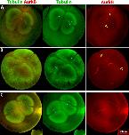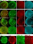 FIGURE 2:. Localization of furrow-inducing protein complexes in polyspermic eggs. Eggs were fixed between first mitosis and first cleavage, stained for AurkB (a subunit of the CPC) and Kif23 (a subunit of Centralspindlin), and imaged by confocal microscopy. Cyan double-headed arrows illustrate sister aster pairs. (A) Normal, monospermic egg. Note plane of CPC- and Centralspindlin-positive microtubule bundles between sister asters. (B) Bispermic egg fixed a few minutes after anaphase onset. The asters have just started to grow. A CPC-positive disk is evident at the plane previously occupied by the metaphase plate, where sister asters recently met. Centralspindlin recruitment is less evident (cyan single arrow in Kif23 image). (C) Bispermic egg fixed midway between anaphase and cleavage. Interaction zones between sister and nonsister asters were evident in the tubulin image. Note a brighter tuft of microtubules that connects the sister pair to the upper left, in register with the centrosomes. This midzone-like morphological marker reveals the previous position of the spindle and was used to identify sister aster pairs in microtubule images. CPC and Centralspindlin have been recruited to the interaction zone between sister asters but not to the zone between nonsister asters. (D) Egg with four sperm fixed early in cleavage. Cleavage has initiated near the animal pole (not shown). This image shows a focal plane near the equator, where three aster pairs are visible. Furrowing had not yet occurred in this focal plane, but asters had grown all the way to the cortex. Note selective recruitment of CPC and Centralspindlin to zones between sister asters. (E) Highly polyspermic egg fixed early in cleavage. The region presented at higher magnification shows a single aster with CPC-positive zones at the junction with several neighboring asters (yellow arrowheads). None of these are zones with its sister aster, which is in a different z-plane.