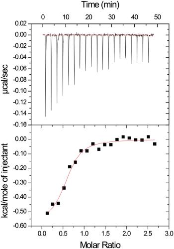 Figure 3. Isothermal titration calorimetry experiment.The MicroCal Auto-iTC-200 was used to obtain the binding affinity of Dvl-C peptide and Dvl PDZ protein in 50 mM phosphate buffer. The concentration of Dvl-C peptide in the syringe was 1.05 mM and the concentration of Dvl PDZ domain in the cell was 0.114 mM. The KD value was averaged from two independent experiments at 25°C.DOI: http://dx.doi.org/10.7554/eLife.08142.005 |