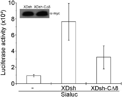 Figure 7. Effect of wild-type XDsh and XDsh-CΔ8 activity on canonical Wnt signaling.Luciferase assay using a Siamois promoter reporter (Sialuc). Sialuc DNA (200 pg) was injected alone or with myc-tagged Xdsh or Xdsh-CΔ8 mRNA (500 pg) into the animal pole region of 2-cell Xenopus embryos. Ectodermal explants were dissected at the early gastrula stage for luciferase assay. Values are the means ±SD from four independent experiments (p < 0.05). Inset shows a representative western blot using anti-myc antibody (9E10) to control for XDsh and XDsh-CΔ8 protein expression in the four experiments.DOI: http://dx.doi.org/10.7554/eLife.08142.012 |