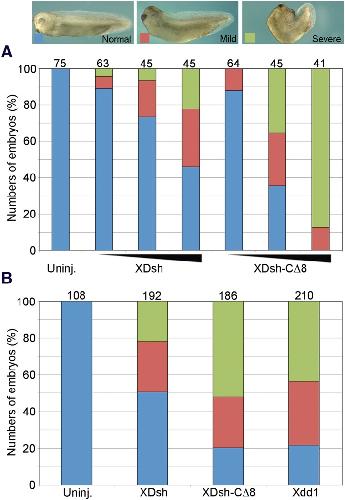 Figure 8. The open conformation of Dvl significantly enhances gain-of-function planar cell polarity (PCP) signaling.(A) Xenopus embryonic abnormal convergent extension (CE) phenotypes induced by injection of wild-type XDsh and XDsh-CÎ8 mRNA at three increasing concentrations (arrows at bottom represent 80 pg, 200 pg and 500 pg of injected mRNA; above are numbers of embryos injected from two independent experiments). Phenotypes are severe (green), mild (red), and normal (blue). (B) Comparison of phenotypes induced by dose-equivalent injections (500 pg mRNA) of XDsh, XDsh-CÎ8, and Xdd1 (a well-established dominant-negative XDsh mutant). XDsh-CÎ8 and Xdd1 induced similar phenotypes. The numbers of embryos injected from three independent experiments are listed on the top of each column.DOI: http://dx.doi.org/10.7554/eLife.08142.013 |