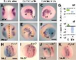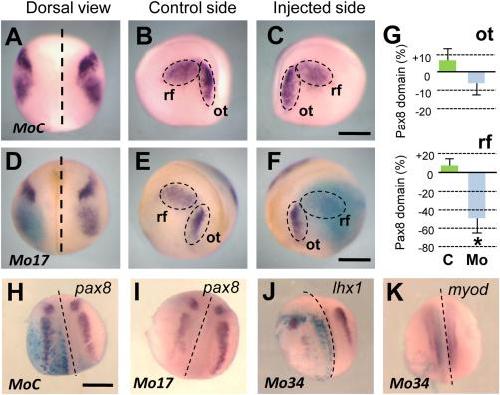 Figure 4. Loss of function of hspa9 interferes with early pronephros determination. AâI: Loss of function experiments using control (MoC) and hspa9-targetted morpholino oligonucleotides at 17 ng (Mo17) were analyzed by pax8 ISH at early neurula stage. Delineations of otic (ot) and renal (rf) areas are depicted. G: Quantitative analysis of both otic and renal territory areas, expressed as percent of the uninjected side, following Mo17 injection (MoC, n=14; Mo17: n=13, p<0.01). pax8-positive otic territory was of the same area on both sides. H,I: Dorsal views of whole-mount pax8 ISH at the end of neurula. A strong decrease was observed on the injected side in Mo17 as compared to the unaffected Mo controls. J,K: Dorsal view of embryos injected with 34 ng of Mo (Mo34) and processed for lhx1or myod ISH. Scale bars 0.5 mm.Download figure to PowerPoint