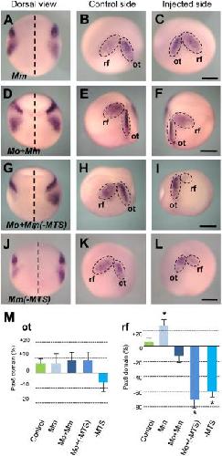 Figure 6. Rescue of Mo-induced reduction of the kidney field requires hspa9 mitochondrial sequence. AâL: pax8 whole-mount ISH at early neurula stage following injection of MmHspa9 (AâC), Mo17+MmHspa9 (DâF), Mo17+MmHspa9(-MTS) (GâI), or MmHspa9(-MTS) (J,L). Delineations of both otic (ot) and renal (rf) areas are depicted. Side of injection was determined by GFP transillumination before ISH. M: Quantitative analysis of pax8-positive otic and renal territories following Mm, Mo+Mm, Mo+Mm(-MTS) and Mm(-MTS) experiments, expressed as percent of the uninjected side. A weak but significant increase of the renal field is measured upon MmHspa9 injection (n = 15; P < 0.01), and reversal of the phenotype in Mo17+MmHspa9 embryos was complete (n = 14). In the Mo17+MmHspa9(-MTS), the renal field was still severely reduced (n = 13; P < 0.001). Injection of Mm(-MTS) significantly altered pronephric field determination (n = 14; P < 0.001).Download figure to PowerPoint