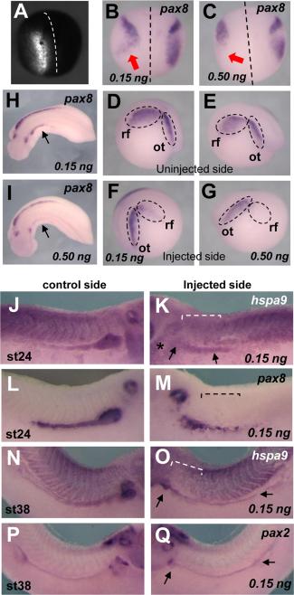 Figure 2. Decreased expression of hspa9 following in vivo reduction of RA signaling. A: Analysis of the GFP tracer distribution on one side of cyp26-injected embryos at neurula stage. BâI: pax8 ISH of cyp26-injected embryos at 0.15 ng (B,D,F,H) or 0.50 ng (C,E,G,I) dose was performed at st14. The otic territory (ot) and kidney field (kf) are specifically labeled by pax8 (DâG) and show a strongly reduced (F) or absent (G) pax8 positive renal field as already noticed on dorsal views (red arrows in B and C). Similar observation is made at st25 on the side of cyp26-injected embryos (H, I). JâQ: Expression of hspa9, pax8 and pax2 upon reduced RA signaling. At st24, hspa9 and pax8 are significantly reduced on the cyp26-injected side in the pronephros area (arrows, K,M). Hspa9 expression is reduced in the most anterior somites areas (white bracket) and branchial arch (*) as well (K). Similar results are obtained when compared with pax2 at late tadpole stage (O,Q). The nephric duct elongation was unaffected at the 0.15 ng dose of cyp26 injection (arrows in O,Q).Download figure to PowerPoint
