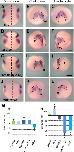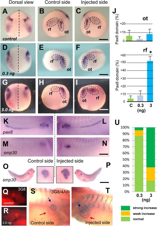 Figure 3. Overexpression of hspa9 enlarges the size of the pronephric tubule. AâI: pax8 whole-mount ISH at early neurula stage following injection of 0, 0.3 or 3.0 ng of hspa9. Dorsal and lateral views show the otic territory (ot) and kidney field (kf) specifically labeled by pax8. Delineations of both areas are depicted. Red-Gal staining indicates the side of injection. J: Quantitative analysis of overexpression of hspa9 on otic and renal territory, expressed as percent of the uninjected side. K,L: At late tail bud stage, pax8 expression seems stronger in the proximal part of the pronephros derived from the injected side, as shown by the Red-Gal staining. MâP: smp30, specific proximal tubular marker, confirms the findings at late tail bud stage (M,N) and tadpole stage (O,P). Q,R: 3G8 immunofluorescence in st32 embryos. S,T: Double-immunofluorescence with 3G8 (black arrows) and 4A6 (red arrows) at st.42 illustrates a longer tubule on the injected (X-Gal stained) than on the noninjected side. U: Histograms represent the summary and the frequency of the enlarged pronephric tubule observed in hspa9-injected embryos, at 0.3 (n = 32) and 3 ng (n = 68).Download figure to PowerPoint
