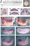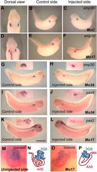 Figure 5. Impaired hspa9 expression in Xenopus laevis disturbs tubular pronephric development. AâF: Whole-mount smp30 ISH in MoC (AâC) and Mo-injected (DâF) tadpole embryos at the dose of 17 ng. G,H: At tail bud stage, smp30 expression is decreased upon Mo34 injection (34 ng). IâL: pax8 (I,J) and pax2 (K,L) ISH confirm the impaired development of the proximal pronephric tubule after reduced hspa9 expression. MâP: Double-immunofluorescence with 3G8 (red) and 4A6 (blue) antibodies (M,O) and corresponding drawings (N,P) illustrate a simplified pronephric tubule on the Mo17-injected side of the embryo.Download figure to PowerPoint