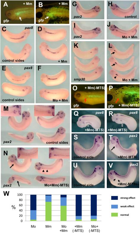 Figure 7. Characterization of the rescued-Mo, failed-rescued and altered (-MTS)-induced pronephros development. A,B: GFP observation illustrates the correct targeting of mesodermal derivatives up to the end of tadpole stage. Arrows indicates gfp-positive tubules. CâF: pax8 whole-mount ISH at early tail bud stage in embryos injected with MmHspa9 alone or in combination with Mo17. GâJ: pax2 whole-mount ISH at early tadpole stage in control and Mo17+MmHspa9 injected embryos. K,L: smp30 whole-mount ISH in early tadpole embryos injected with Mo17+MmHspa9. A stronger signal is present on all rescued embryos (arrows). M,N: pax2 whole-mount ISH in early tadpole embryos injected with Mo17+MmHspa9(-MTS). Arrows point to a lack of pax2 positive pronephros and arrowheads to a simplified proximal tubule. O,P: GFP signals were missing in pronephros area of MmHspa9(-MTS) injected tadpoles. Q,R: pax8 expression is severely reduced in MmHspa9(-MTS) injected embryos at stage 21. SâV: Reduced or absent pax2 signals are observed in MmHspa9(-MTS) injected tadpoles. W: Histograms represent the frequency of normal, weakly and severely modified pronephros in all groups (Mo, n = 78; Mm, n = 38; Mo+Mm, n = 50; Mm (-MTS), n = 40; Mo+Mm(-MTS), n = 41).Download figure to PowerPoint