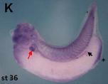 hspa9 (heat shock protein family A (Hsp70) member 9 ) gene expression in Xenopus laevis embryo, assayed via in situ hybridization, NF stage 36, lateral view, anterior left, dorsal up.
