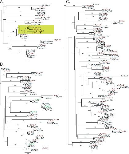 Full-length protein sequences of F-box proteins categorized into subgroups were used to construct maximum likelihood phylogenies; A. F-box proteins with WD40 repeats (Fbxw), B. F-box proteins with leucine rich repeats (Fbxl), and C. F-box proteins with other domains (Fbxo). A Xenopus F-box protein (red) is considered homologous if it clusters with mammalian proteins. Green shaded branch shows Xenopus specific Fbxw7-like genes. Xenopus Fbxl sequences in green lack an identifiable LRR domain but are found to be highly associated with Fbxl proteins (see S1 Fig). Bootstrap values higher than 50 are shown. Arrowheads show X. tropicalis specific F-box proteins.