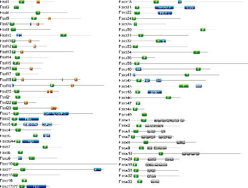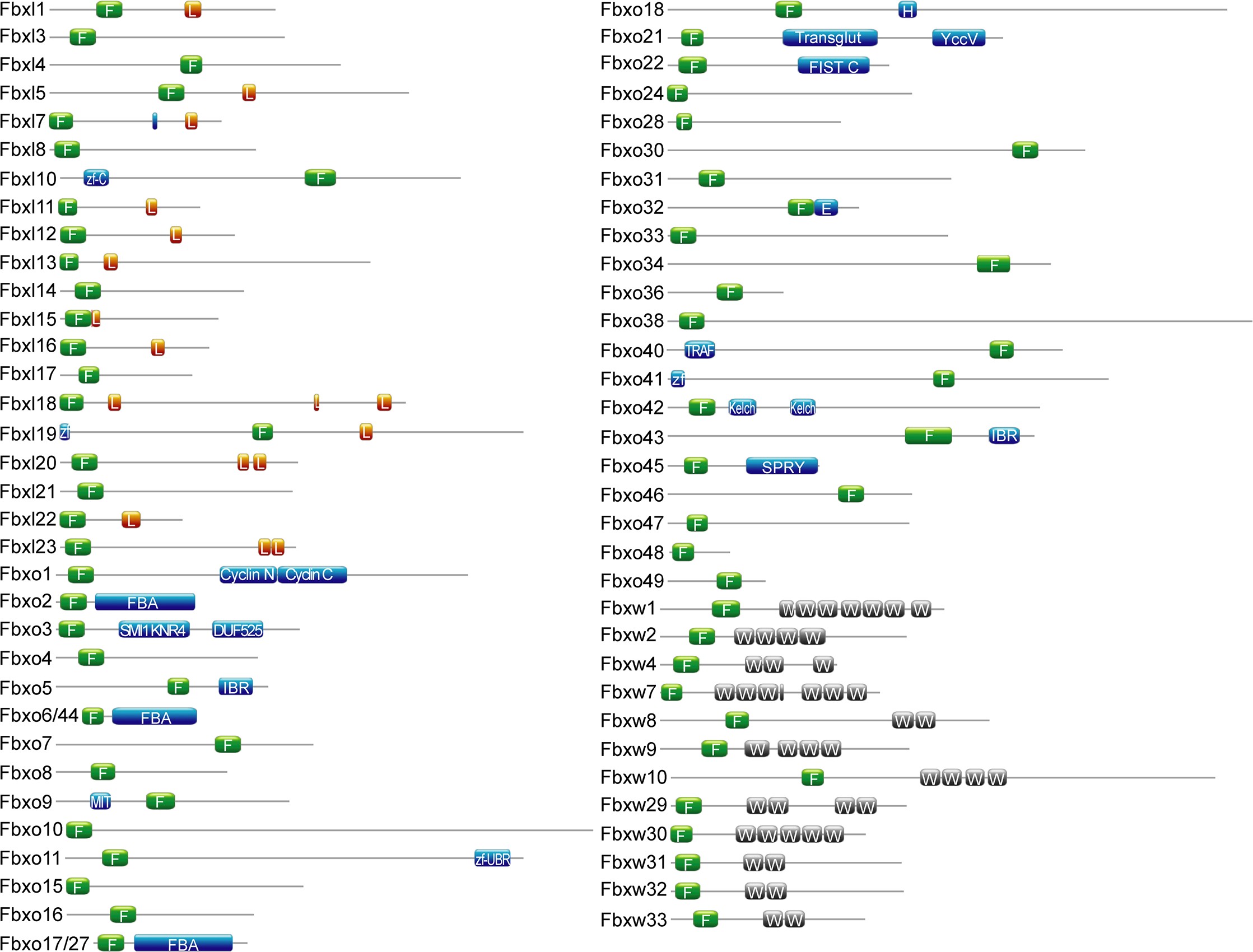 Domains identified by Pfam include F-box motif (F, green), WD40 repeat (WD, gray), leucine-rich repeat (L, orange), F-box-associated domain (FBA), between-ring domain (IBR), Kelch repeat, zf-CXXC zing finger domain (zf-C or zf), Cyclin N and Cyclin C domains, SMI1 KNR4, microtubule interacting and trafficking domain (MIT), zinc finger in N-recognin (Zf-UBR), SPla and the RYanodine Receptor (SPRY), TNF-receptor associated factor (TRAF), Elongin A (E), FIST C domain, Transglutaminase-like superfamily (Transglut), Hemimethylated DNA-binding protein YccV like (YccV), UvrD Helicase (H).