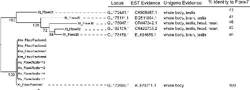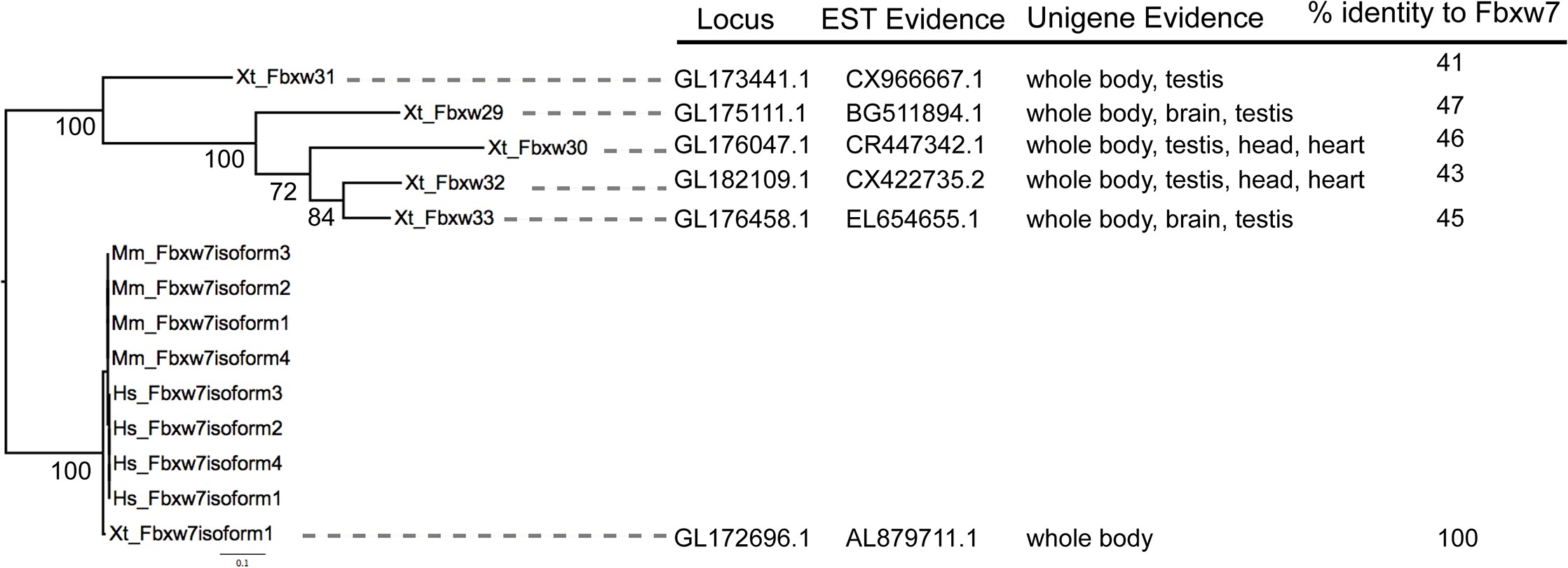 Fbxw7-like genes show moderate similarity to Fbxw7, are in a distinct location in the genome, and expressed in X. tropicalis (NCBI EST and Unigene databases).