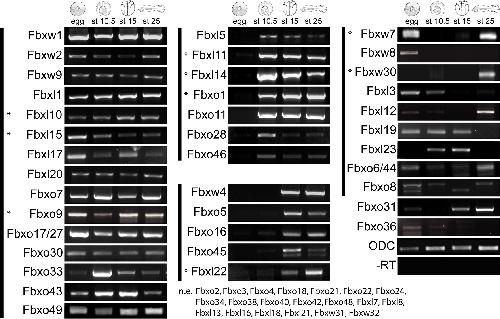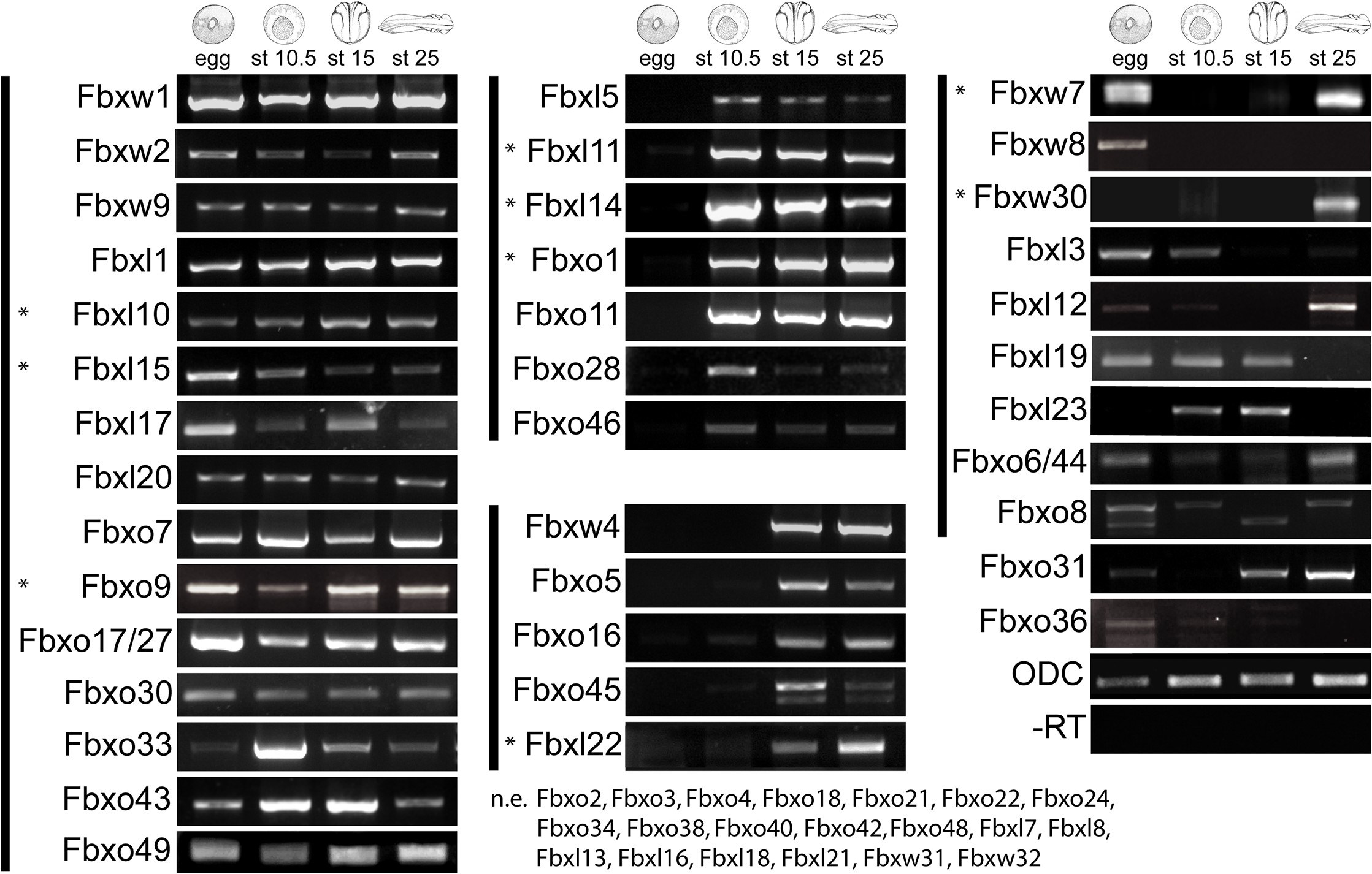 RT-PCR analysis of F-box gene during early embryonic development. ODC was used for loading control.âRT was performed for each gene but a representative for ODC was shown. Expression panels are grouped by shared temporal expression: genes expressed at all 4 stages are in the left column; in 3 zygotic stages in the top middle; in neurula and tailbud in the bottom middle and in a random pattern in the right column. The asterisks indicate the genes whose spatial expressions are shown in Fig 5. N.e. represents genes that are not expressed