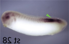 fbxo28 (F-box protein 28) gene expression in Xenopus laevis embryo, assayed via in situ hybridization, NF stage 26, lateral view, anterior left, dorsal up.