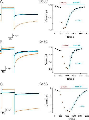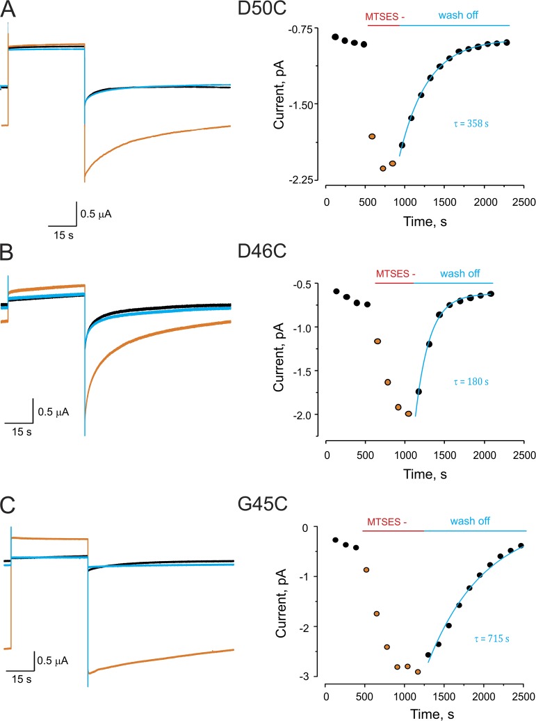 Figure 2. Reversible chemical modification by MTS at cysteine residues lining the Cx26 pore. (A) MTSES modification at D50C. (Left) Current traces from an oocyte expressing Cx26 D50C hemichannels in response to a depolarizing pulse from −80 to 0 mV. Black trace is the current before modification. Orange trace is a representative trace in the presence of MTSES after reaching the maximal effect of the modification. Blue trace is the current after wash off of MTSES. (Right) Time course of the maximal tail currents in the absence, the presence, and after wash off of MTSES. Solid blue line represents single-exponential fit for recovery from modification. (B and C) The corresponding data for MTSES modification at positions D46C and G45C, respectively. Experimental procedure as described in A. All traces were obtained in the presence of 0.25 mM of extracellular Ca2+.