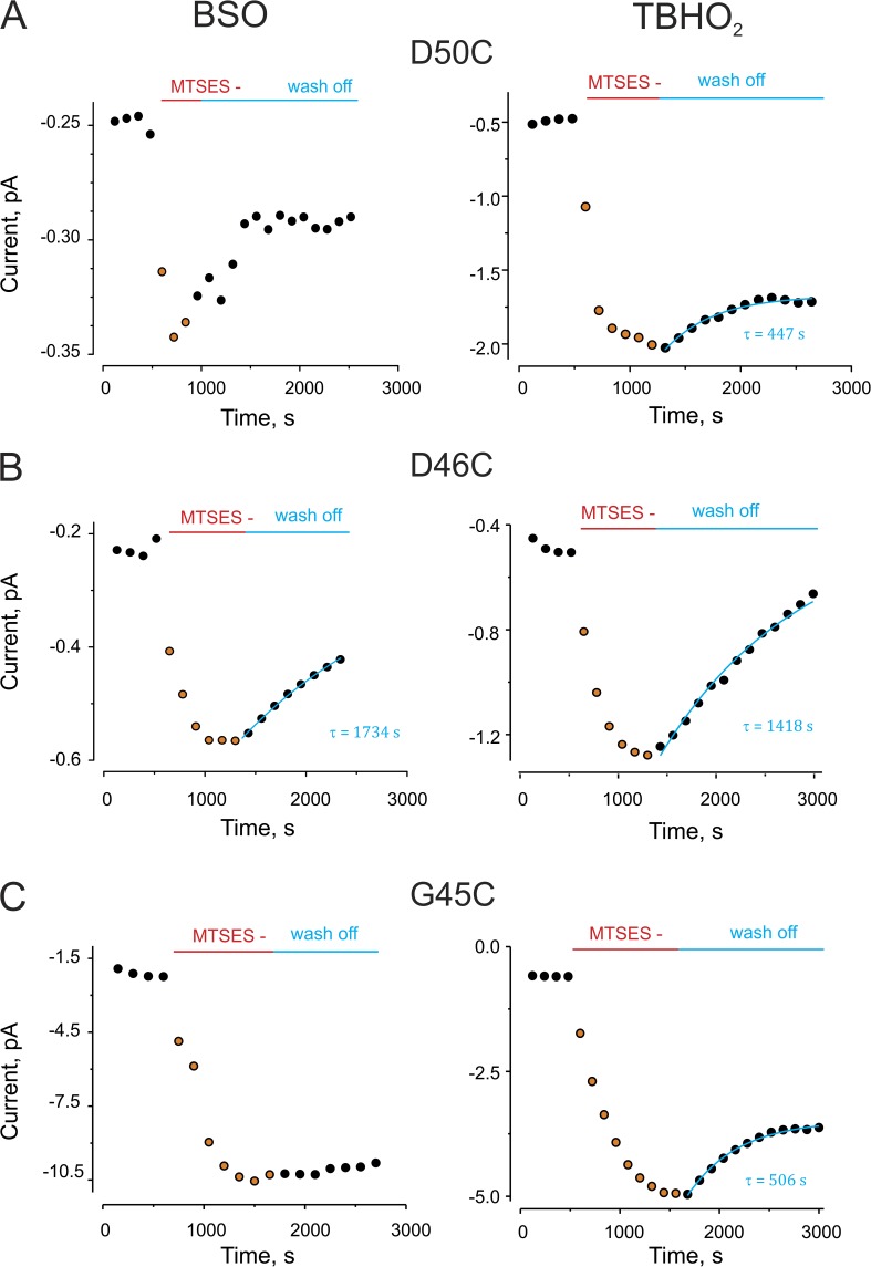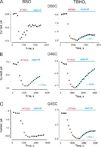 Figure 3. Decreased levels of cellular rGSH decelerate or diminish reversibility of MTS modification. BSO and TBHO2, which decrease cytoplasmic rGSH levels, decelerate and/or diminish reversibility of the MTSES modification. (A) A representative experiment for MTSES modification at position D50C. (Left) Dots show the time course of maximal tail current for an oocyte pretreated with 2 mM TBHO2, which was then exposed to MTSES. Wash off of MTSES was in the presence of TBHO2. (Right) Same experiment, but with 24–48-h preexposure to BSO. The tail currents were measured in the presence of 0.25 mM of extracellular Ca2+ after a depolarizing pulse from −80 to 0 mV. (B and C) Representative experiments for MTS modification at positions D46C and G45C, respectively, as described in A.