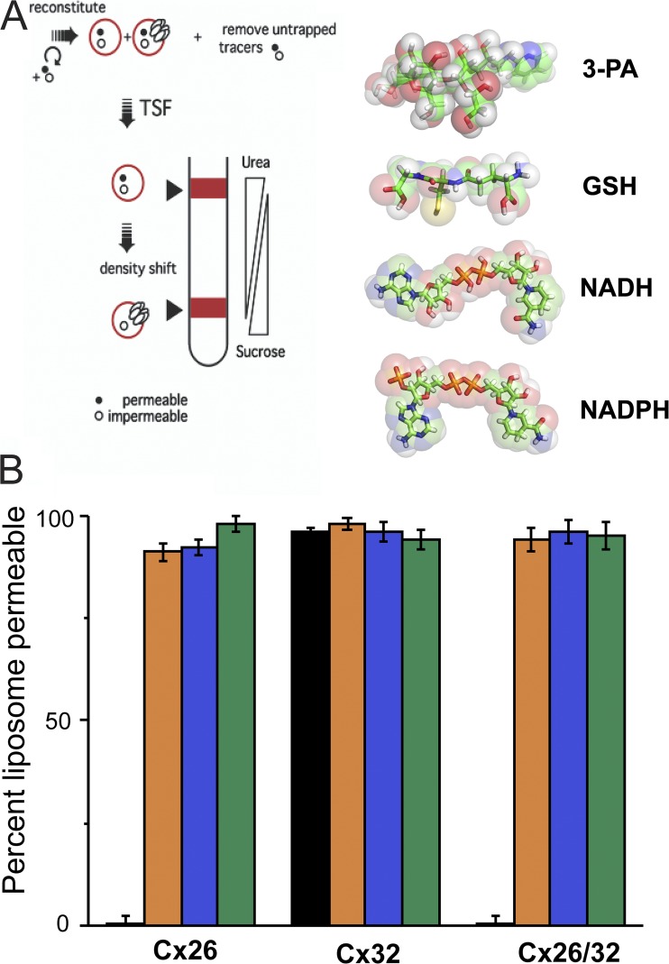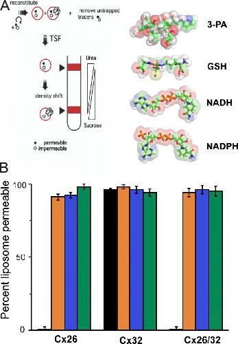 Figure 5. Connexin hemichannels are permeable to cytosolic reductants. (A; left) Scheme of TSF method. (Right) Chemical structure of 3-PA and endogenous cellular reductants. (B) Percentage of liposomes permeable to cytosolic reducing agents for liposomes containing either homomeric or heteromeric hemichannels formed by Cx32, Cx26, and Cx32/26. Orange bars, GSH; blue bars, NADH; green bars, NADPH. Homomeric and heteromeric hemichannels were fully permeable through all tested reducers. 3-PA (black bars), a trisaccharide derivative known to be permeable through Cx32 channels but not Cx26-containing channels, was used as control. Error bars represent the mean ± SEM of at least three independent measurements.