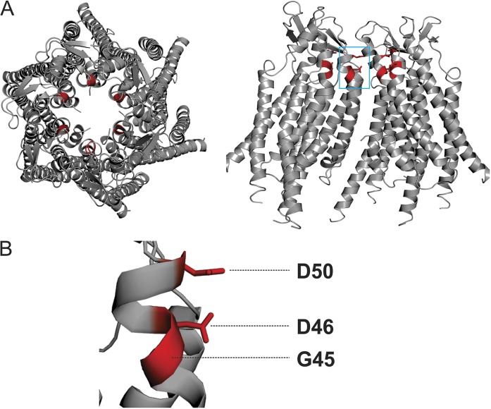 Figure 1. Residues selected for chemical modification in the Cx26 hemichannel. (A) Top (left) and side view (right) of the human Cx26 hemichannel crystal structure. Four subunits are shown in the side view to show the pore-lining region. (B) Magnification of residues D50, D46, and G45, all highlighted in red.