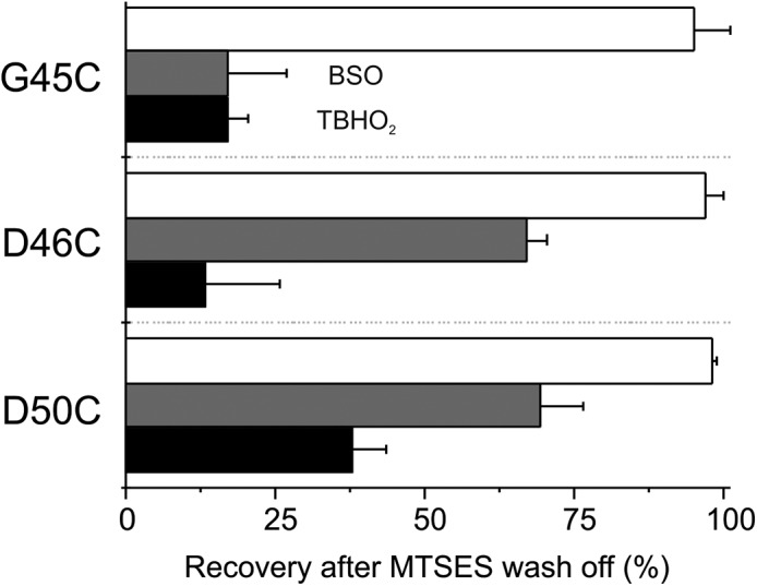Figure 4. BSO or TBHO2 treatment significantly decreases recovery after MTSES modification. Percentage of recovery from MTSES modification after BSO (gray bars) or TBHO2 (black bars) treatment in oocytes expressing D50C, D46C, or G45C. White bars correspond to recovery from MTSES modification without any treatment. The values were normalized at steady state or after 300 s of MTSES wash off. Error bars represent the mean ± SEM of at least eight independent measurements.