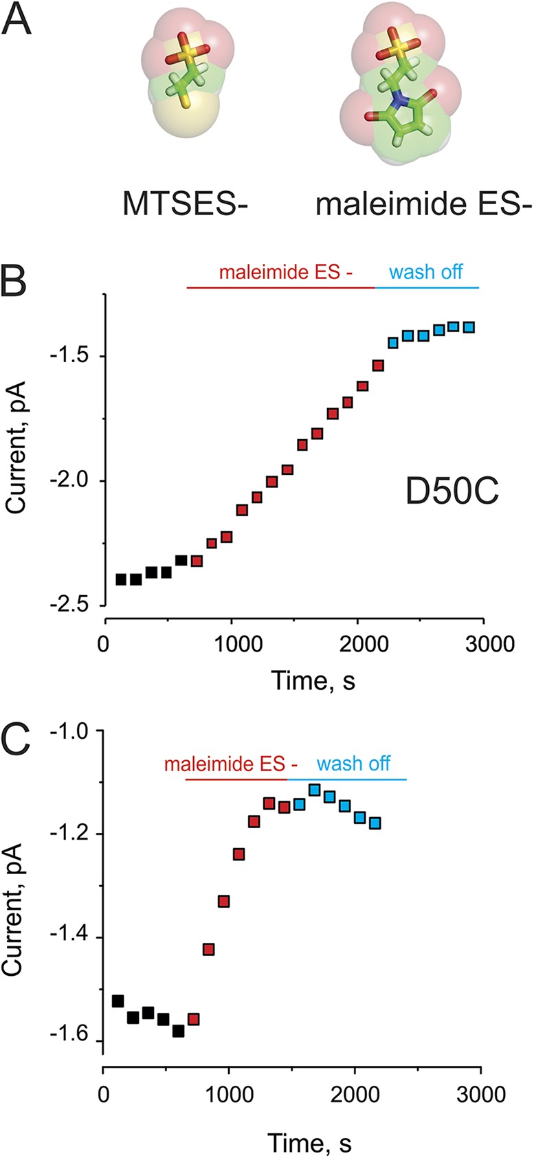 Figure 6. Irreversible maleimide modification at cysteine residues lining the pore. (A) Comparison of the chemical structures of MTSES and maleimide ES. (B) Time course of the peak tail current in the absence (black), the presence (red), or after wash off (blue) of maleimide ES for modification of D50C hemichannels expressed in Xenopus oocytes. (C) Maleimide ES modification at positions G45C, as described in A.