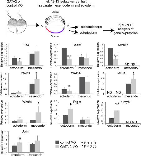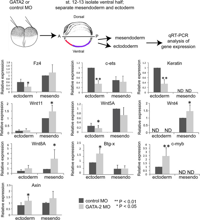 Fig. 3. GATA2 regulates expression of Wnt pathway components and target genes during gastrulation. GATA2 or control MO (40 ng per embryo) was injected into two-cell embryos. At stage 12â13, the ventral half of the embryo was removed as illustrated and dissected into ectodermal or mesendodermal pieces. The location of cells that will give rise to the anterior VBI (red) and posterior VBI (purple) is indicated. RNA was extracted from pooled ectoderm or mesendoderm (mesendo) and gene expression analyzed by qPCR for each target gene. Quantification of relative gene expression (mean±SD) in at least three independent experiments is shown.