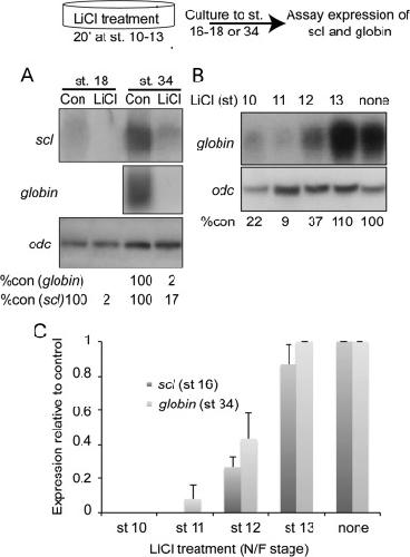 Fig. 5. Upregulation of canonical Wnt signaling during gastrulation represses hematopoietic specification Schematic of approach used to transiently activate canonical Wnt signaling. Briefly, embryos at the stages specified were incubated in LiCl solution for 20 min, followed by several washes in 0.1X MBS culture medium. Embryos were allowed to develop to stage 16â18 or 34 and assayed for expression of globin and/or Scl. (A) Embryos were treated with LiCl at stage 10, allowed to develop to stage 18 or 34 and assayed for expression of Scl and/or globin by Northern blotting. Levels of globin or scl transcripts are normalized and reported as a percentage of globin or scl levels in untreated embryos below each lane. (B) Embryos were treated with LiCl at stages 10, 11, 12 or 13, allowed to develop to stage 34 and expression of globin was determined by Northern blotting. Levels of globin transcripts are normalized to and reported as a percentage of globin levels in untreated embryos below each lane. (C) Embryos were treated with LiCl at stages 10, 11, 12 or 13, allowed to develop to stage 16 or 34 and expression of scl or globin was determined by qPCR in three independent experiments.