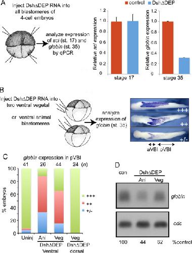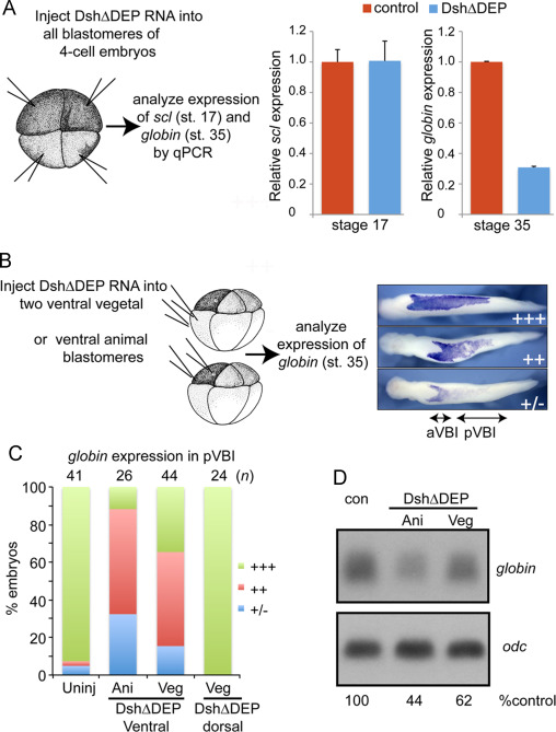 Fig. 7. Non-canonical Wnt signaling is required in ectodermal and mesodermal cells for primitive erythropoiesis. (A) RNA encoding DshâDEP (500 pg) was injected into each blastomere of 4-cell embryos as illustrated and expression of scl and globin was analyzed by qPCR at stage 17 and stage 35, respectively. (BâD) RNA encoding DshâDEP (750 pg) was injected into each ventral animal pole or ventral vegetal pole blastomere of 8-cell embryos as illustrated. (C) Expression of globin was analyzed by WMISH at stage 34 and globin staining in the posterior VBI (pVBI) was scored as barely or not detectable (â/+), moderately decreased (++) or strong (+++) using the scale illustrated on the right in panel C. (D) Expression of globin was determined by Northern blotting at stage 34. Levels of globin transcripts are normalized to and reported as a percentage of globin levels in control embryos below each lane. In this blot, the control lane contains RNA from CS2+ injected embryos and is the same control shown for Fig. 6 since all samples were run on the same gel. Results were replicated in two additional experiments.