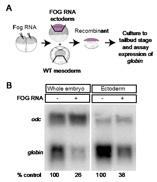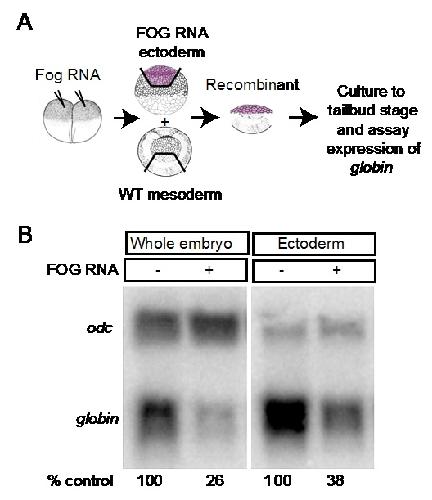 Figure S2. Overexpression of FOG in the ectoderm blocks blood formation. (A) Schematic of ectoderm-mesoderm recombination assay. (B) RNA encoding FOG (250 pg) was injected into each cell of two-cell embryos. At stage 10, ectoderm was explanted from uninjected controls or from embryos injected with FOG RNA. Ectodermal explants were co-cultured with ventral mesoderm explanted from wild type embryos until intact siblings reached the tailbud stage and analyzed for expression of globin by Northern blotting. Levels of globin are normalized to ODC and reported as a percentage of control below each lane. Results were replicated in one additional experiment.