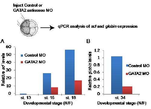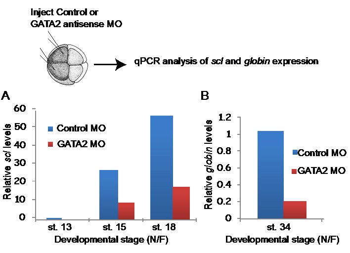Fig. S3. Ectodermal GATA2 is required for commitment to hematopoietic fate. Control or GATA2 MOs (40 ng total) were injected into both ventral animal pole blastomeres of 8-cell embryos as illustrated and qPCR was used to analyze expression of (A) scl at stage 13, 15 or 18 or (B) globin at stage 34. An identical result was obtained in two out of two experiments.