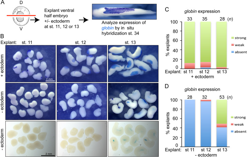 Fig. 1. Signals from the ectoderm are required to induce blood formation in the mesoderm during gastrulation. (A) Illustration of ectoderm removal assay. The ventral half of embryos was isolated and ectoderm was either retained or removed from explants at stages 11, 12 or 13. Explants were allowed to develop until intact siblings reached the tailbud stage (stage 34) and assayed for expression of globin by WMISH. (B) Photographs of representative globin stained explants mounted in PBS (top two rows) or in Murrays clear (bottom row). (C, D) Quantitation of percent of explants expressing globin when cultured in the presence (C) or absence (D) of ectoderm. Results are pooled from 2â3 independent experiments for each group.