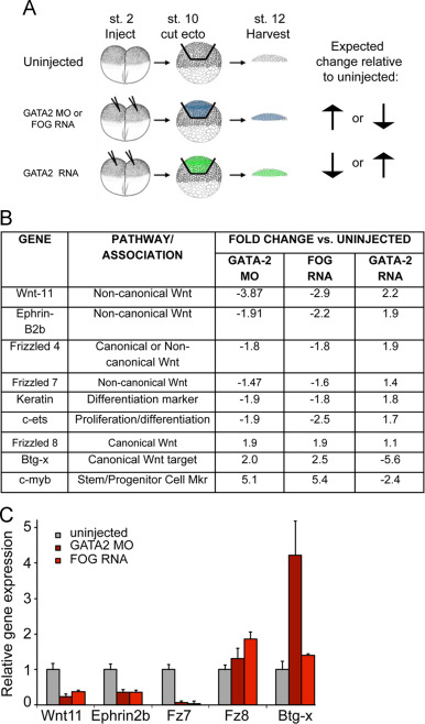 Fig. 2. Microarray approach to identify ectodermal GATA2 targets required for blood formation in the mesoderm. (A) Schematic of microarray strategy and sample acquisition. Embryos were injected at the two-cell stage with GATA2 MO (40 ng), FOG RNA (500 pg) or GATA2 RNA (500 pg) and cultured to the early gastrula stage (stage 10). Ectoderm was explanted and cultured to stage 12, at which point ectodermal explants in each group were pooled and RNA was extracted for microarray analysis. (B) Genes identified by microarray analysis that are predicted to be relevant for hematopoiesis (C) qPCR analysis of gene expression in ectodermal explants isolated at stage 10 from embryos injected with GATA2 MOs or FOG RNA and cultured to stage 12. Quantification of relative gene expression (mean±SD) in three independent experiments is shown.