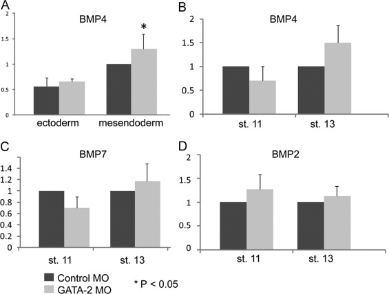 Fig. 4. GATA2 is not required for expression of Bmp2, Bmp4orBmp7during gastrulation. (A) GATA2 or control MOs (40 ng per embryo) were injected into two-cell embryos. At stage 13, the ventral half of the embryo was removed and dissected into ectodermal or mesendodermal pieces that were analyzed for expression of Bmp4 by qPCR. Quantification of relative gene expression (mean±SD) in four independent experiments is shown. (BâD) GATA2 or control MOs were injected into two-cell embryos and expression of Bmp4, 7, and 2 was analyzed by qPCR in whole embryos at stage 11. Quantification of relative gene expression (mean±SD) in three independent experiments is shown.