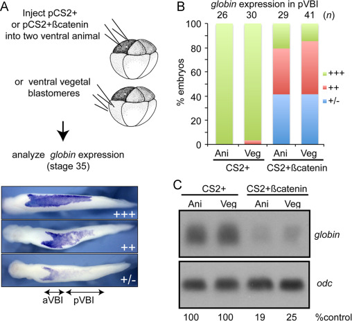 Fig. 6. Upregulation of zygotic canonical Wnt signaling in either ectodermal or mesodermal cells disrupts primitive erythropoiesis. (A and B) Empty CS2+vector DNA or CS2+Ãcatenin DNA (100 pg per blastomere) was injected into both ventral animal pole or vegetal pole cells of 8-cell embryos as illustrated and expression of globin was analyzed by WMISH at stage 34. Globin staining in the posterior VBI (pVBI) of experimental embryos was scored as barely or not detectable (â/+), moderately decreased (++) or strong (+++) using the scale illustrated in panel A. (C) Embryos were injected as illustrated in panel A and expression of globin was determined by Northern blotting at stage 34. Levels of globin transcripts are normalized to and reported as a percentage of globin levels in CS2+ embryos below each lane. Results shown were replicated in one additional experiment.