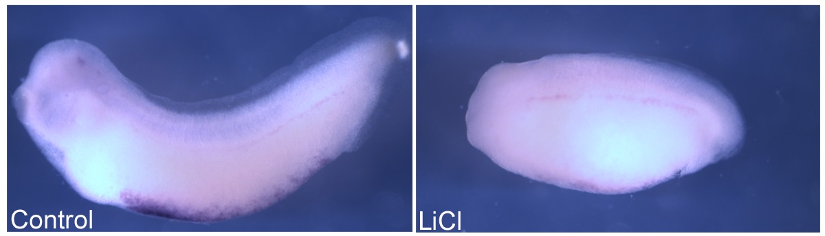Fig. S4. Upregulation of canonical Wnt signaling during gastrulation leads to a loss of blood. Embryos were incubated in the absence (control) or presence of LiCl for 20 minutes at the onset of gastrulation (st. 10). Expression of scl was analyzed by WMISH at stage 32.